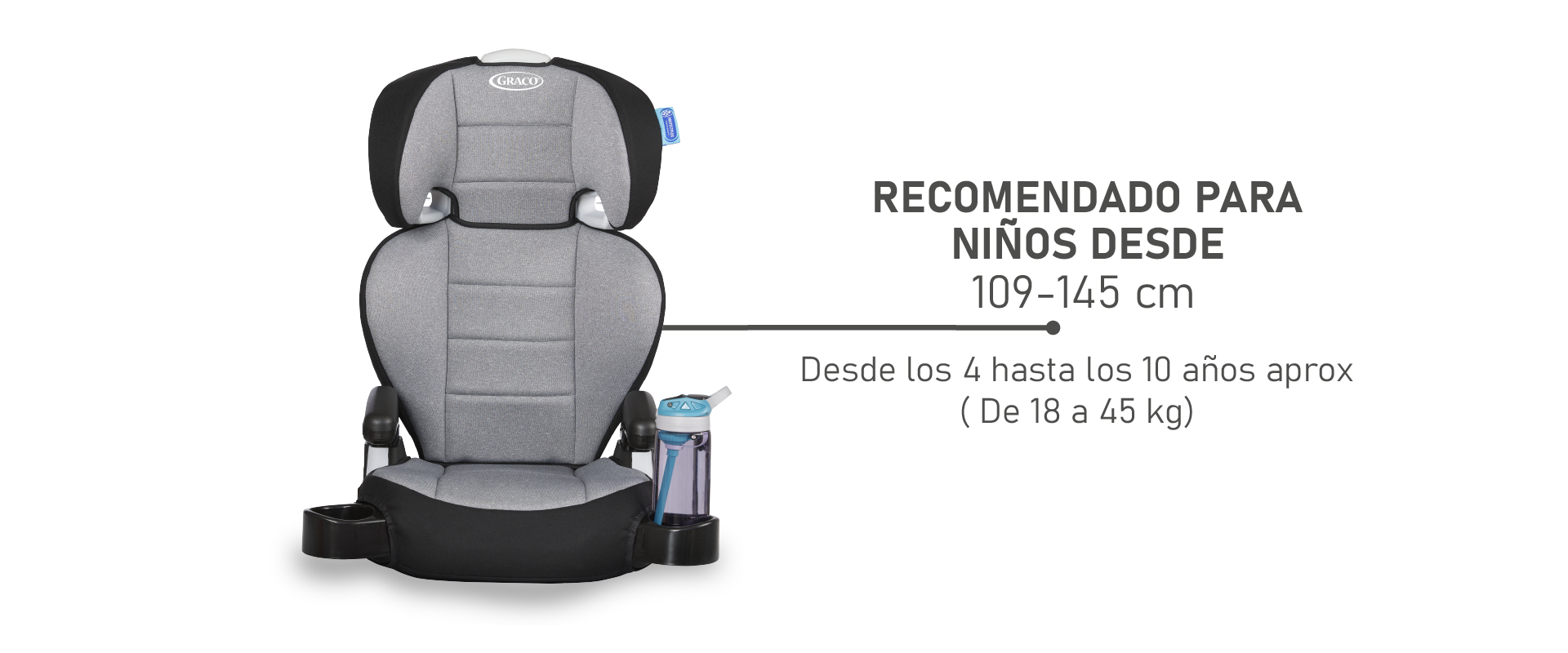 Se puede utilizar18 a 45 kg y una estatura de 109 cm a 145 cm. Este práctico booster 2 en 1 se transforma fácilmente de asiento con respaldo a sin respaldo, adaptándose a las diferentes etapas del desarrollo de tu hijo.