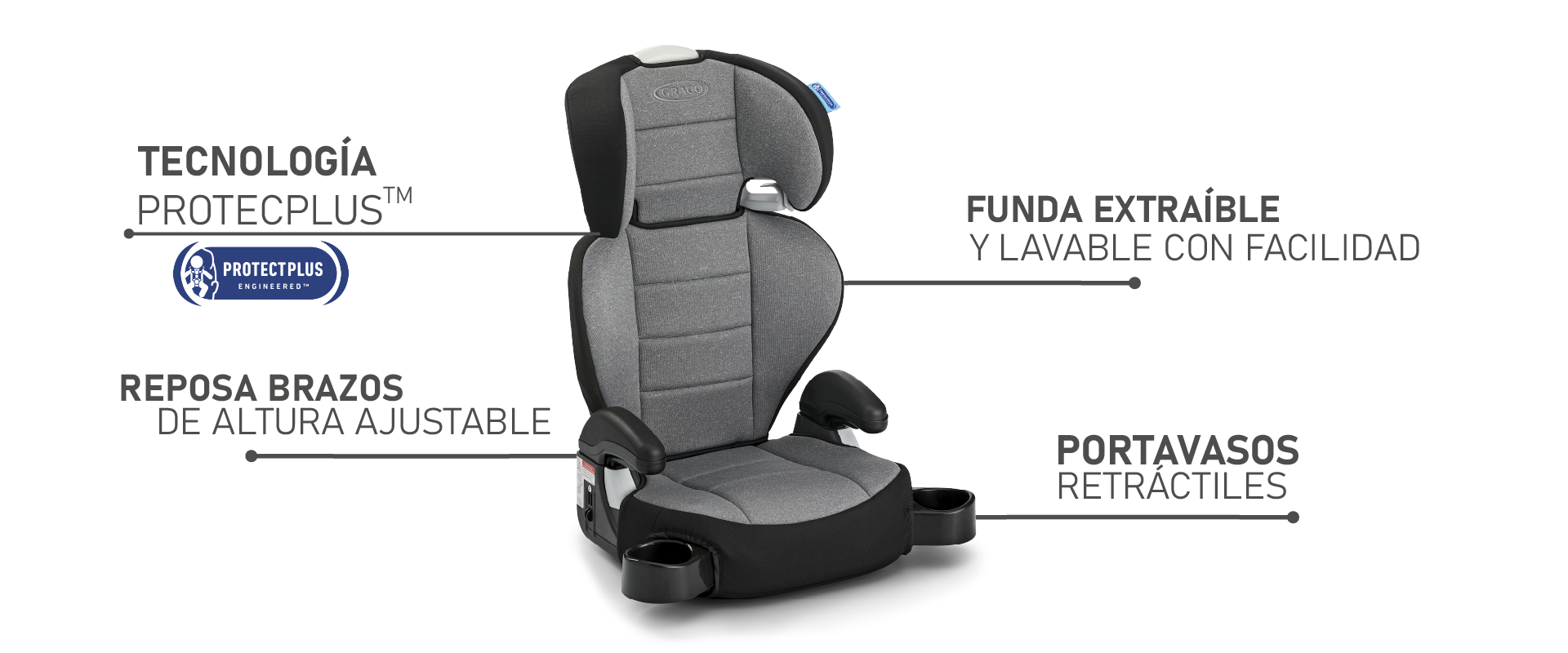 Además, Graco® TurboBooster® 2.0 incorpora la tecnología de seguridad Graco® ProtectPlus Engineered™, que ofrece protección confiable ante impactos frontales, laterales, traseros y vuelcos.