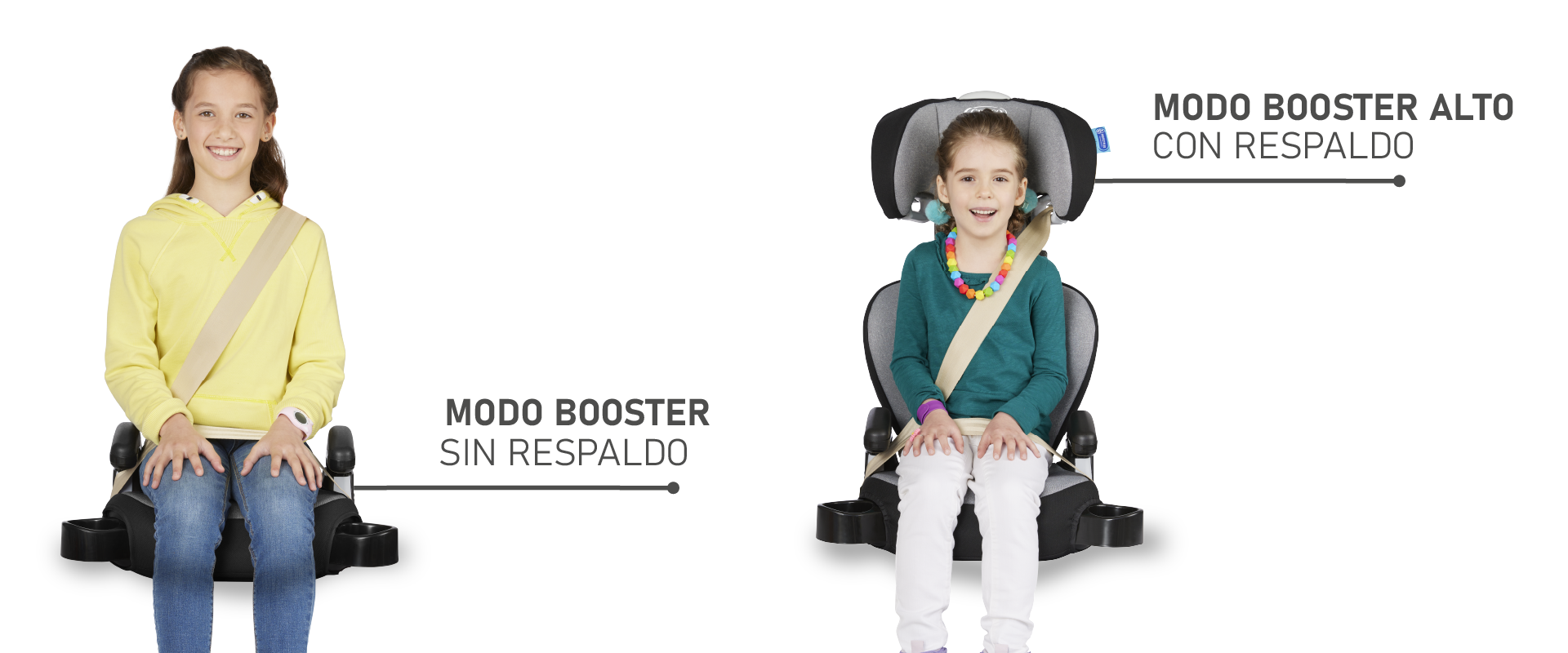 Cuenta con dos modos de uso: como booster con respaldo para mayor soporte y seguridad, o sin respaldo, ideal para niños más grandes que aún necesitan elevación para el cinturón de seguridad.