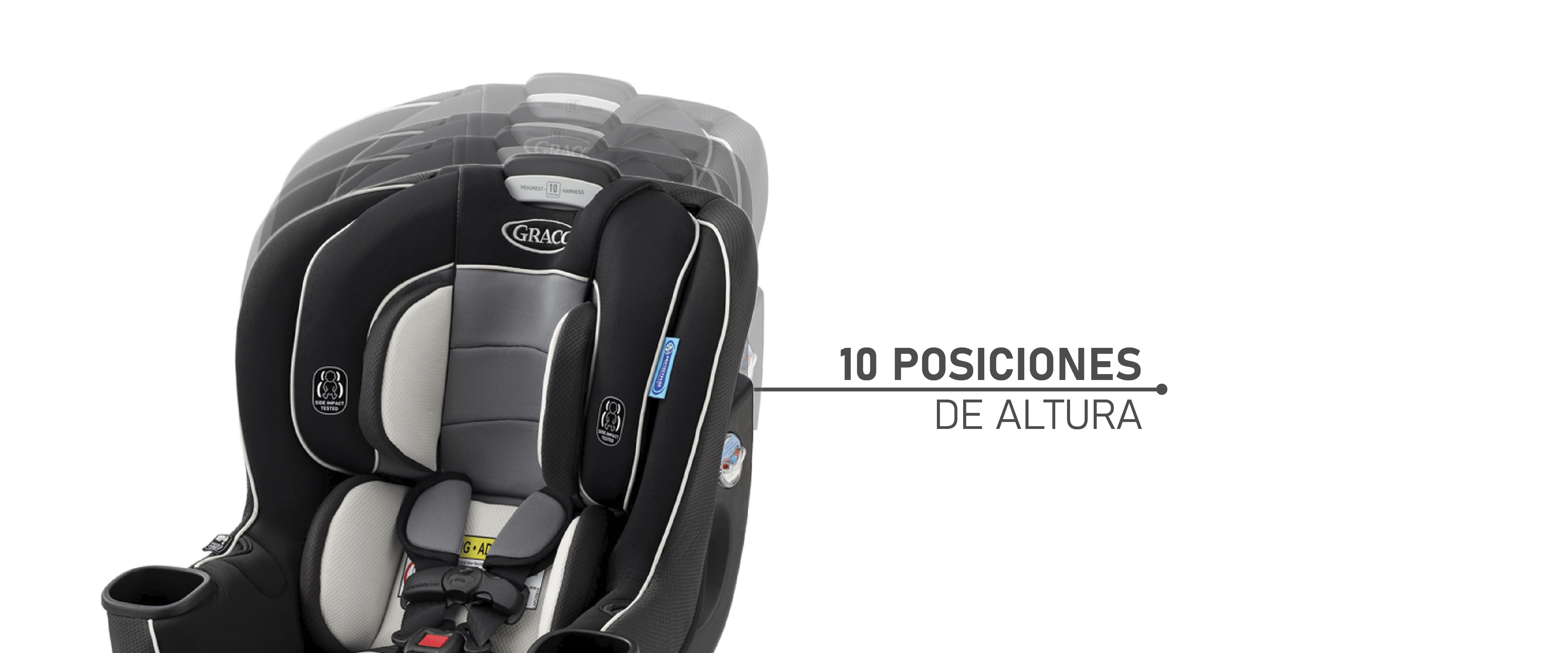 ¡Cuenta con 10 posiciones de altura Simply Safe Adjust™, esto permite que conforme se utilizan las posiciones de altura a través del tiempo, el arnés de 5 puntos acompaña al respaldo de la butaca, ideal para usar la altura correcta del arnés!