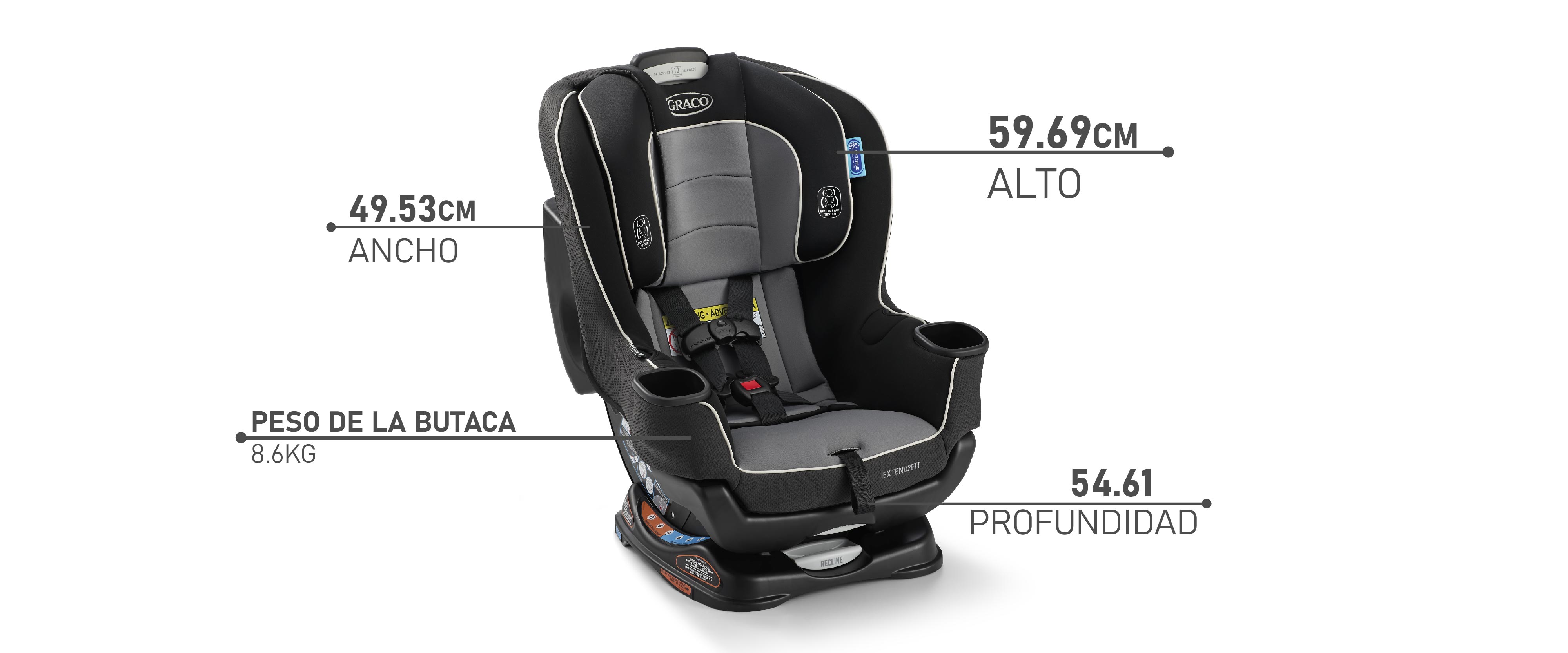 La Extend2Fit es una butaca que cumple las primeras dos etapas, primero vamos a contra marcha hasta los 22kg gracias a su panel extensor que permite alargar la vida útil en esta etapa, siendo esto lo que la hace diferente a las demás butacas. La segunda etapa es a favor de marcha de 10kg a 30kg con arnés de 5 puntos y broche pectoral.