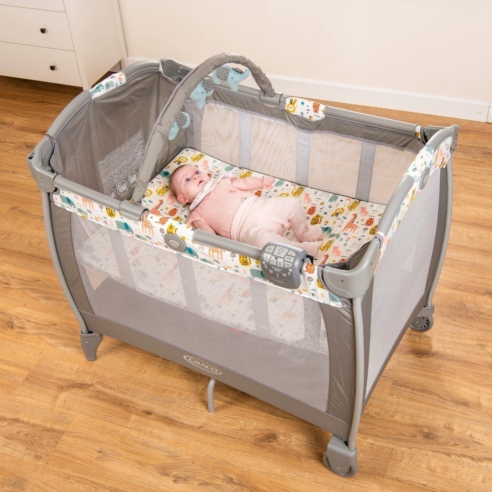 A medida que tu hijo crezca, incluye un cambiador, un arco de juguetes y una caja de control extraíble que te permite controlar la música, la vibración y la luz nocturna.